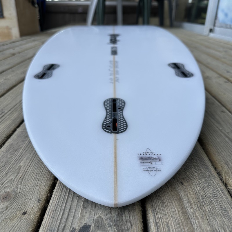 Carène : Un simple concave profond sous le pied avant se transformant en double concave vers les dérives pour une accélération instantanée.