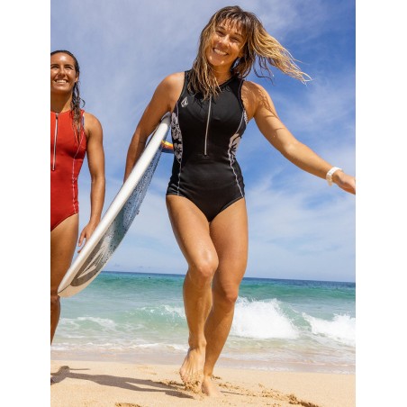 Le système Front Zip (zip poitrine) facilite l’entrée et la sortie de la combinaison, tout en offrant une meilleure étanchéité que les zips dorsaux classiques dans ce type de combis courtes. La coupe Short John (sans manches) laisse les épaules libres, ce qui est idéal pour la rame, le bodyboard ou les activités nautiques actives.